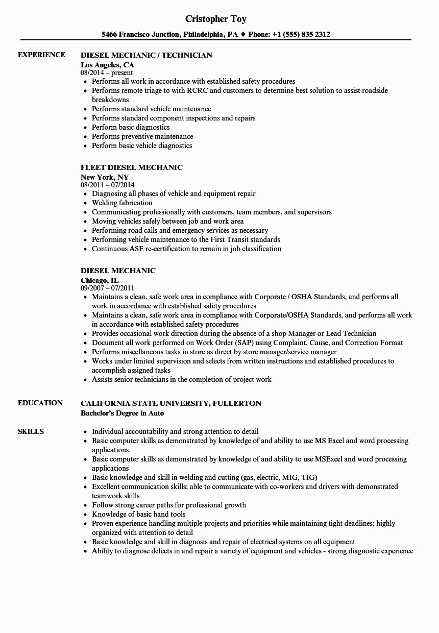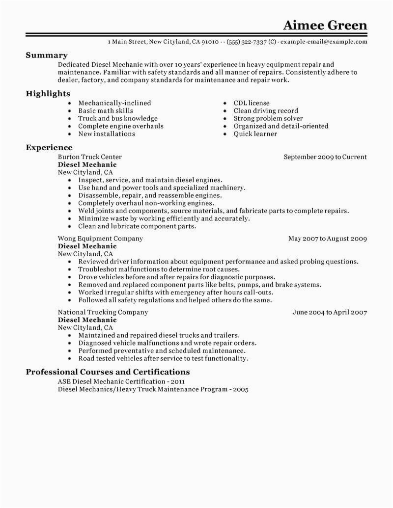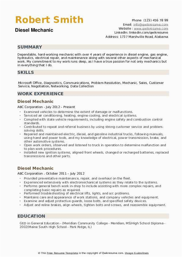 Best Diesel Mechanic Resume Example From Professional