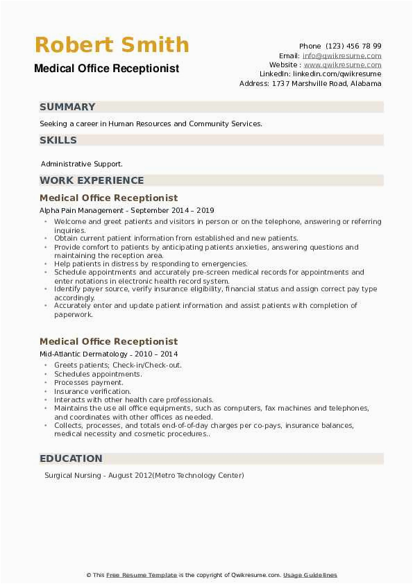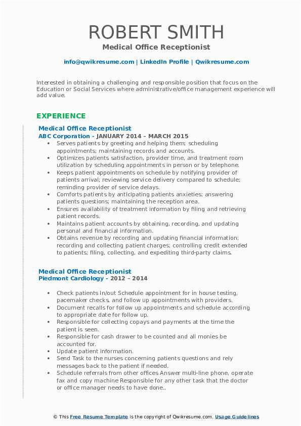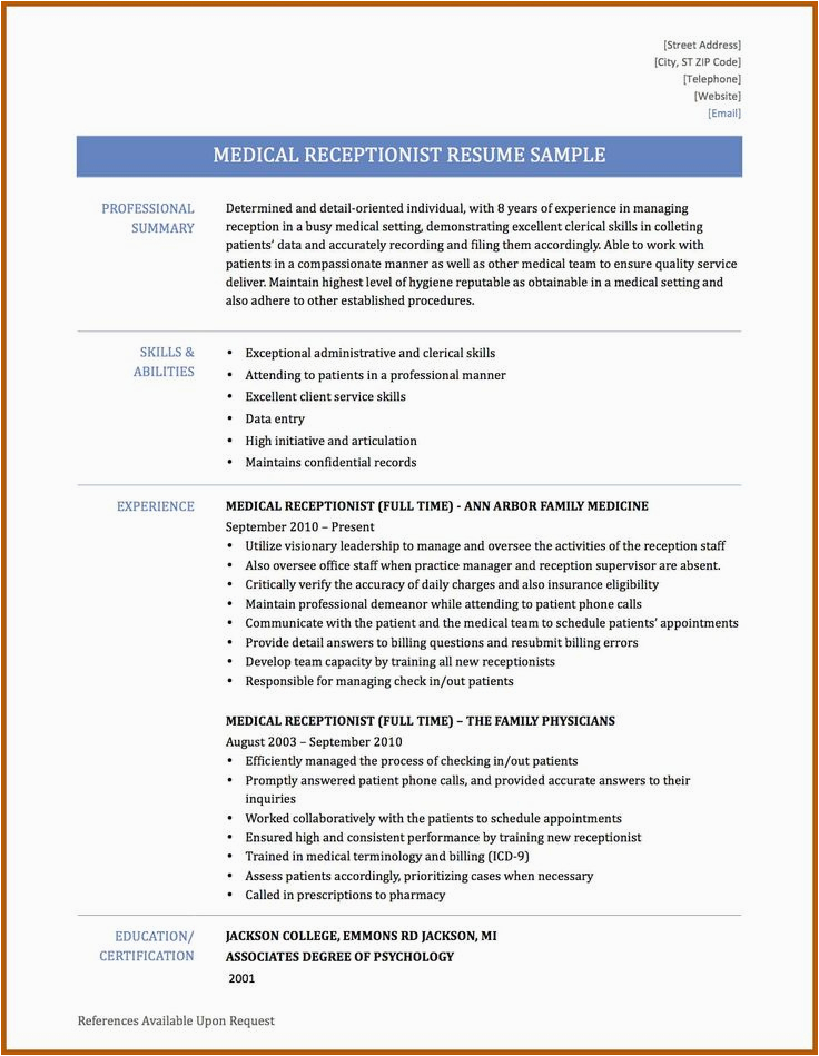 Considering you are searching for the absolute job, you will of course desire to put your best foot forward when an fabulous and well-formatted resume. One habit of assuring that you have such a resume is to download a sample resume for doctors office receptionist. These templates can present you later the exact resume you are looking for or helpfully use them as a lead to create your own.