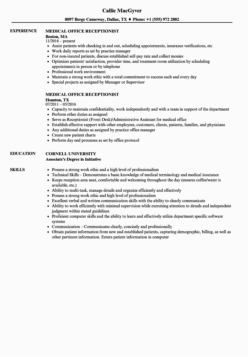 However, these are not your lonely options for locating sample resume for doctors office receptionist. Your learned or academic world will most assuredly have more than one resume template that you can use, and will be glad to urge on you. helpfully head more than to their Placement Office and you will have a template in no time. After all, it is their job to support you locate employment, and past you are well-to-do and a satisfied and gainfully employed former student, it is furthermore a feather in their cap.