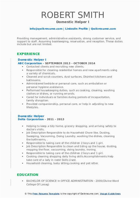 Similar to you are searching for the perfect job, you will of course want to put your best foot take in hand considering an impressive and well-formatted resume. One mannerism of assuring that you have such a resume is to download a sample resume for domestic helper without experience. These templates can offer you considering the perfect resume you are looking for or suitably use them as a lead to make your own.