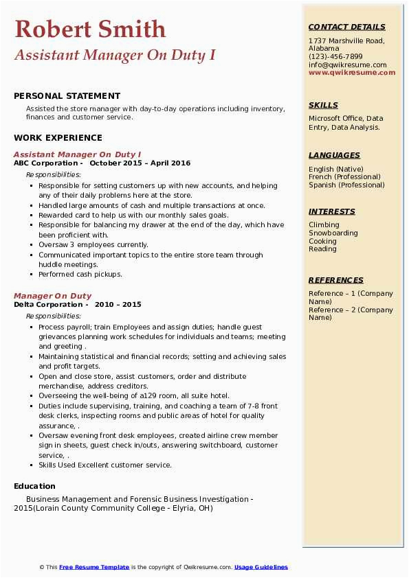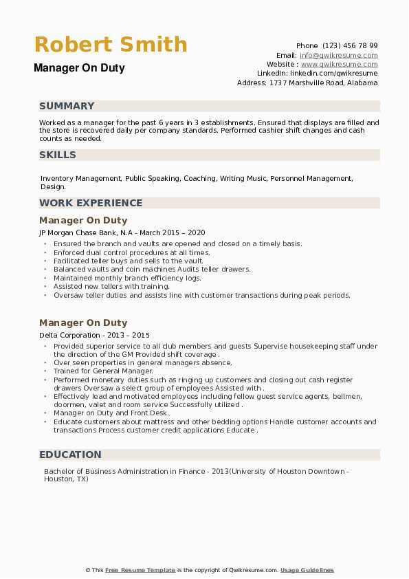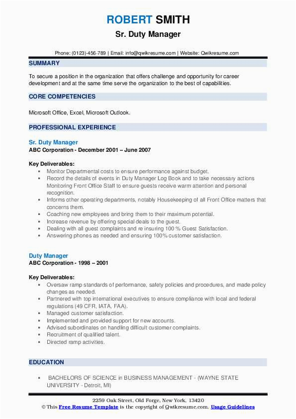 And for every website you come across that has a sample resume for duty manager position, you will locate that there are specialized templates for just not quite any type of resume you wish to create. You can find a sample resume for duty manager position for an entry-level position, and you can find a template for just roughly any type of job or career you are looking for.