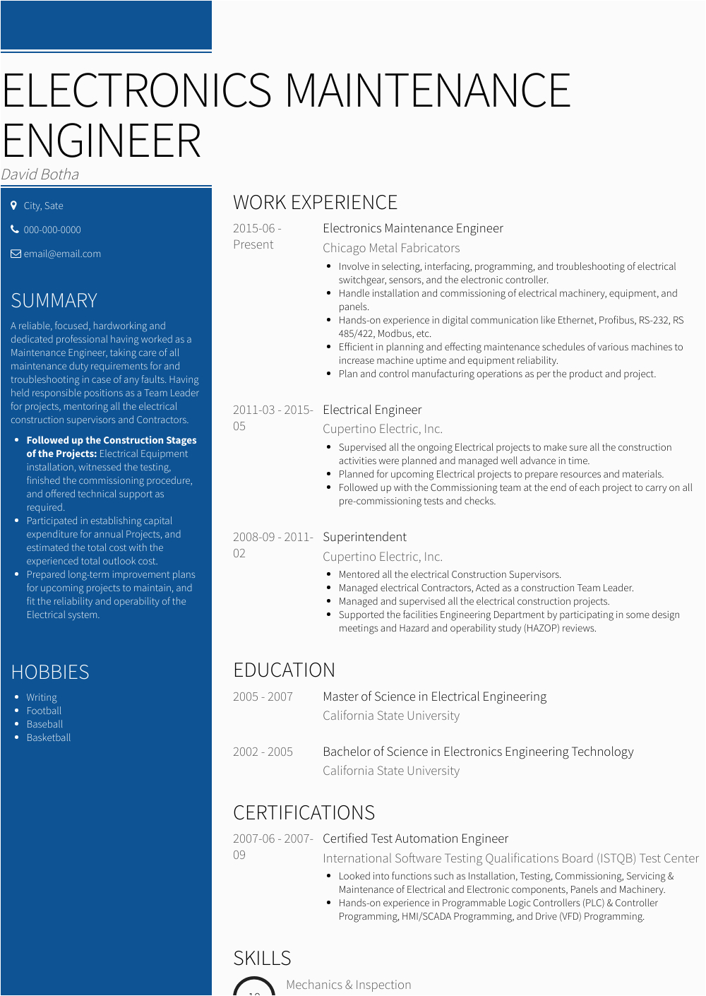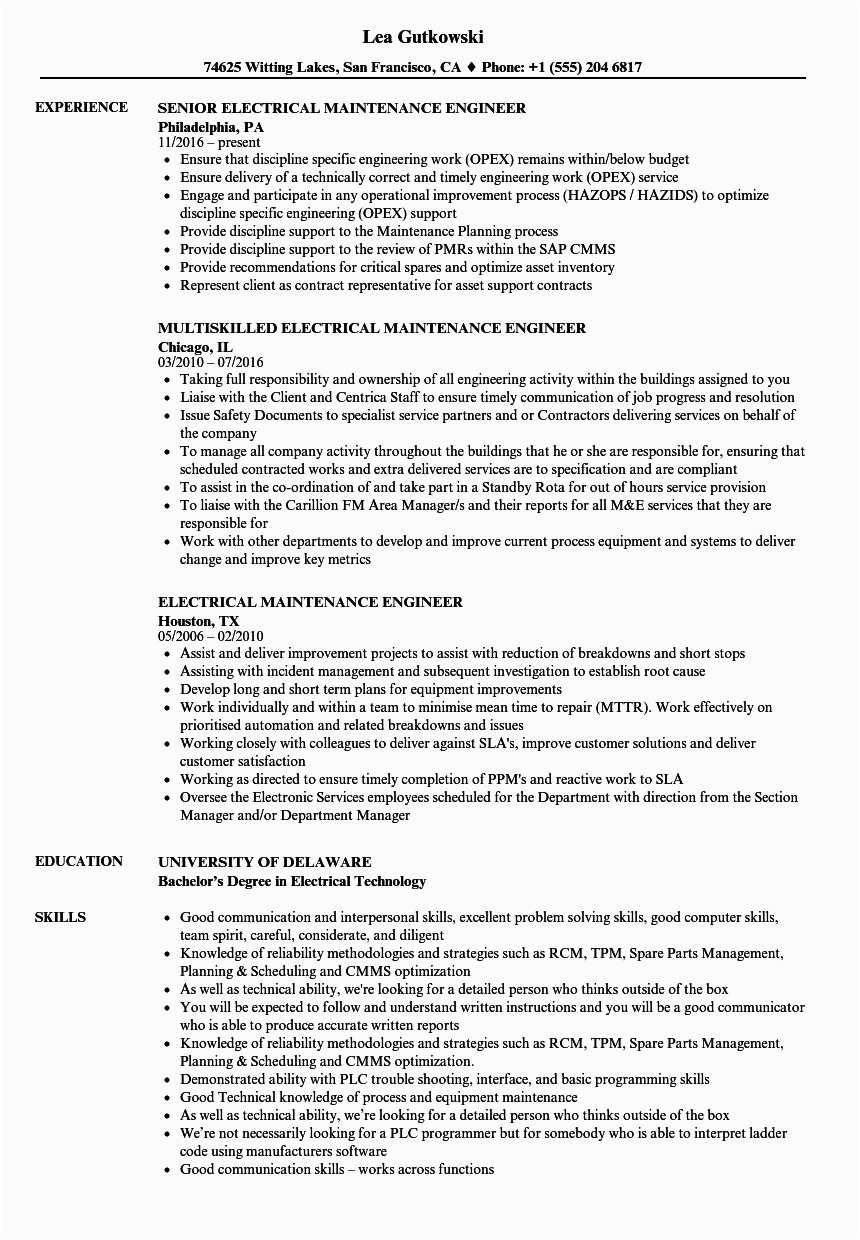 There are appropriately many options for you as you search for the perfect sample resume for electrical engineer maintenance pdf, and with some hard be in and perseverance upon your part, you will find yourself past a first-class resume in no time, and hopefully, a first-class employer, as well!. For more suggestion upon resumes or for a sample resume for electrical engineer maintenance pdf checkout this recommended websites.