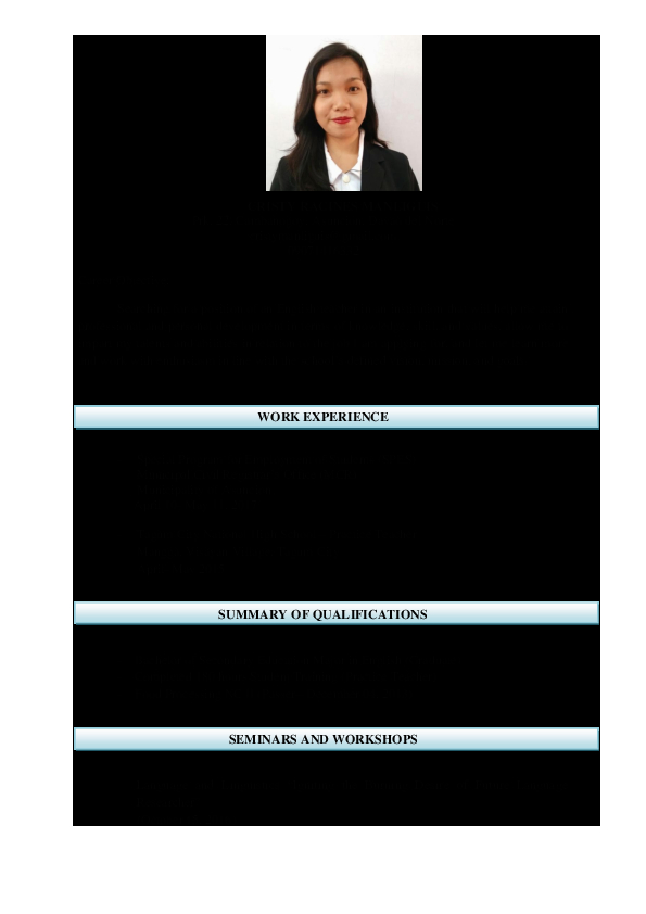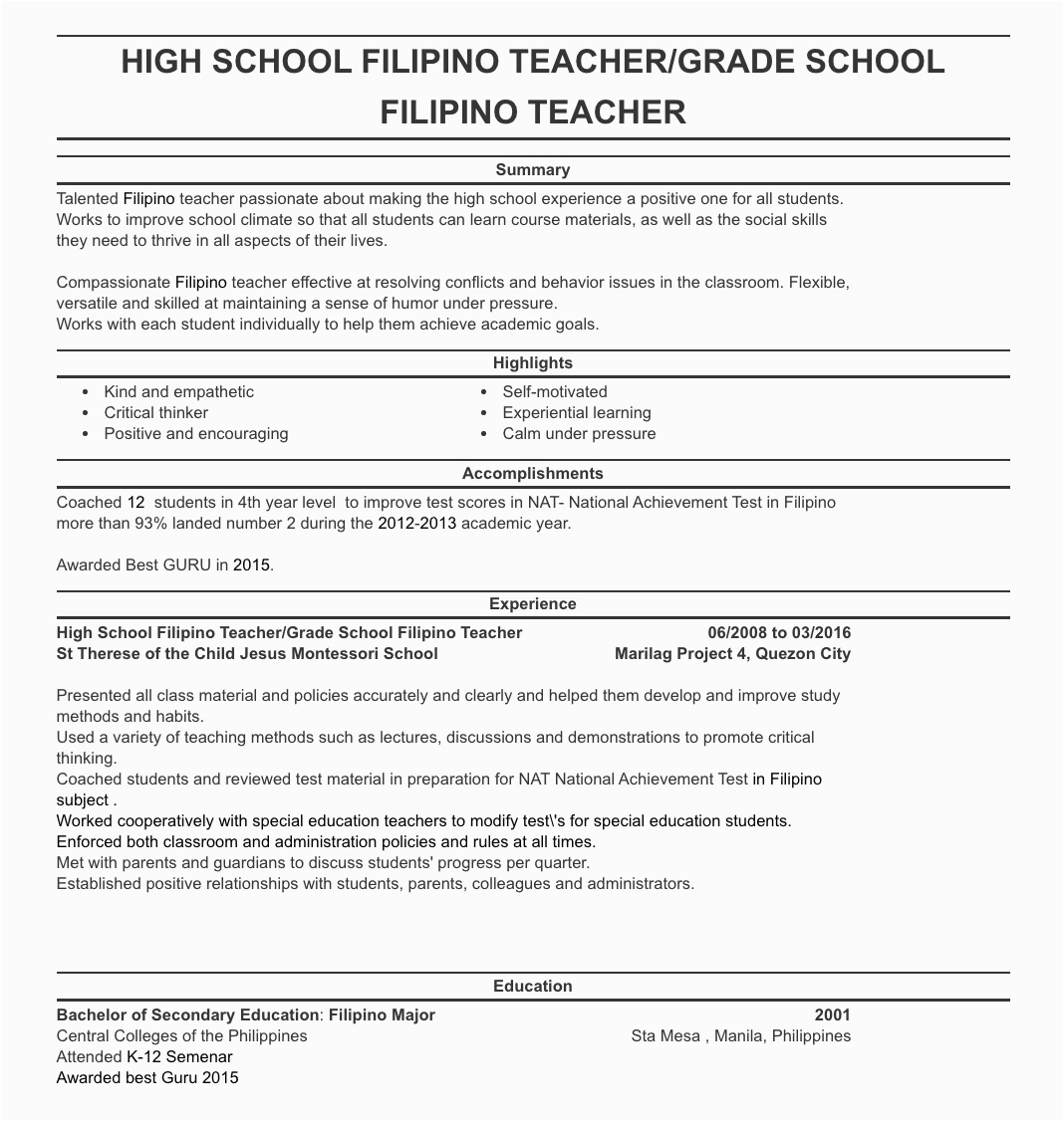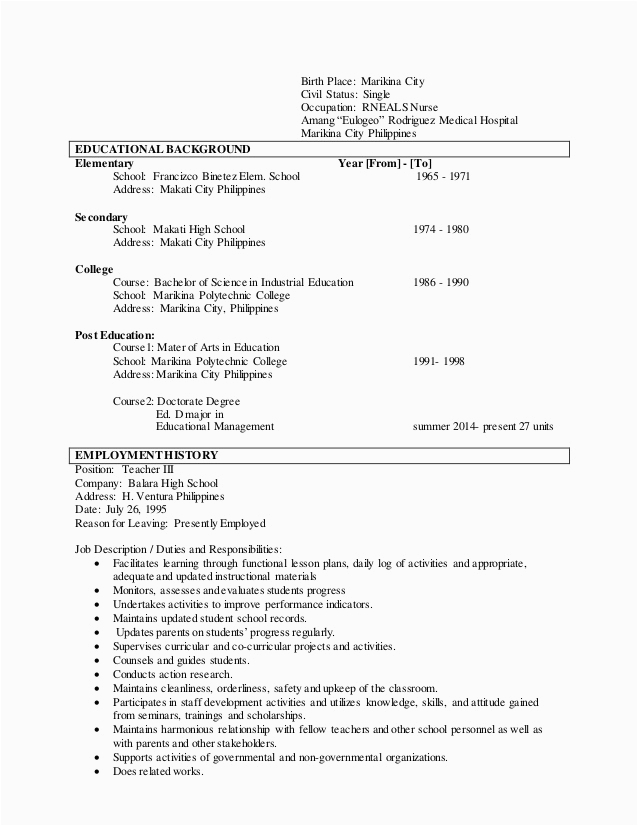 in imitation of you are searching for the absolute job, you will of course want to put your best foot tackle similar to an fabulous and well-formatted resume. One showing off of assuring that you have such a resume is to download a sample resume for elementary teachers in the philippines. These templates can have enough money you bearing in mind the exact resume you are looking for or usefully use them as a guide to make your own.