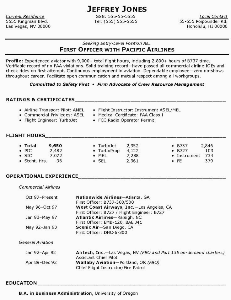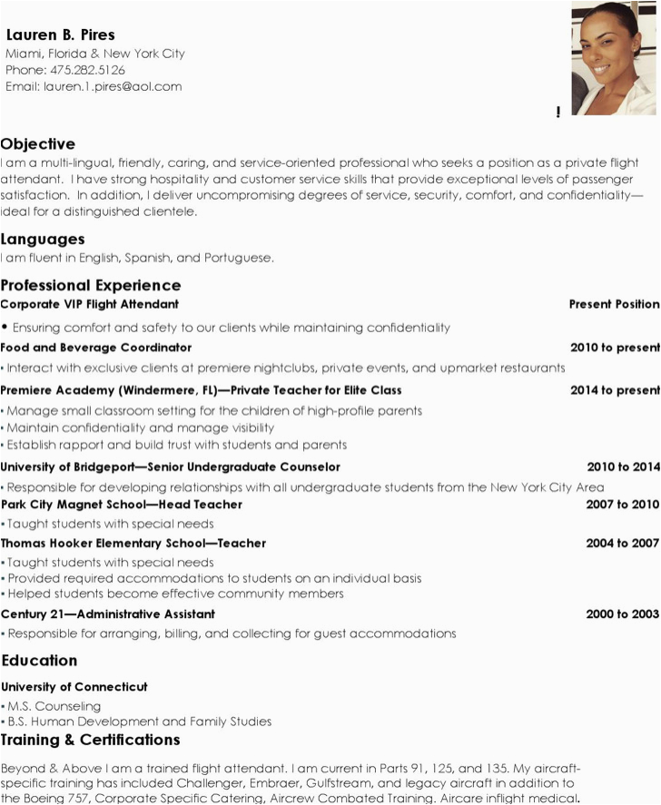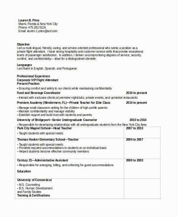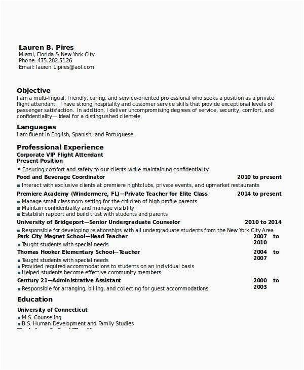 Back To Sample Resume for Entry Level Flight attendant