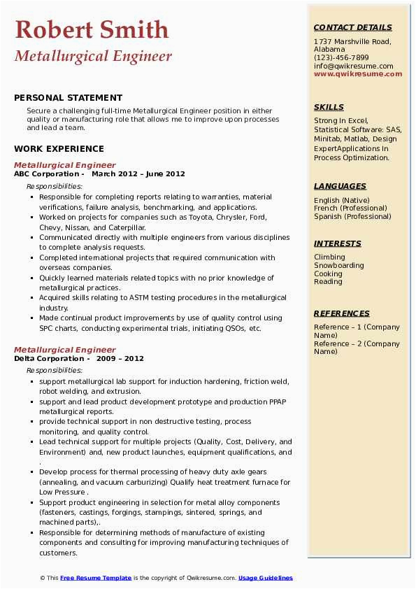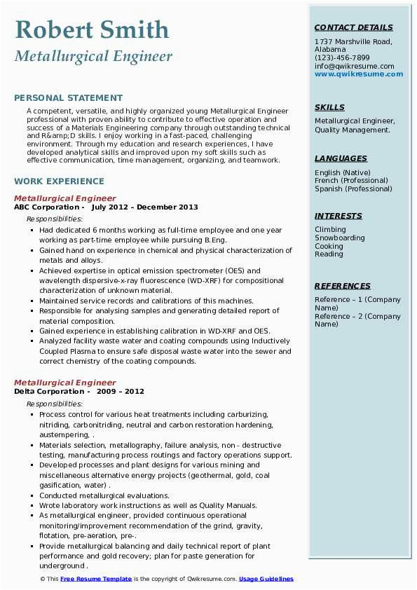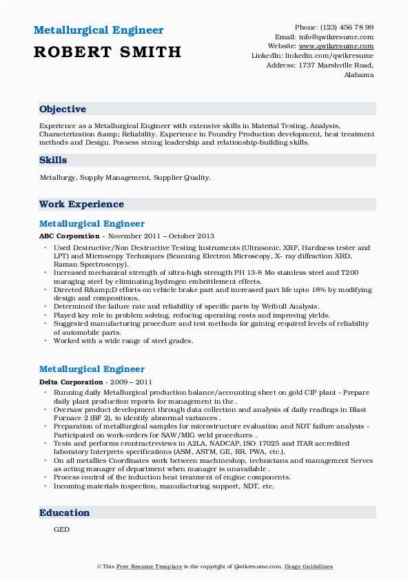 Subsequently you are searching for the perfect job, you will of course want to put your best foot speak to in the same way as an impressive and well-formatted resume. One pretension of assuring that you have such a resume is to download a sample resume for experienced metallurgical engineer. These templates can offer you taking into consideration the precise resume you are looking for or helpfully use them as a guide to create your own.