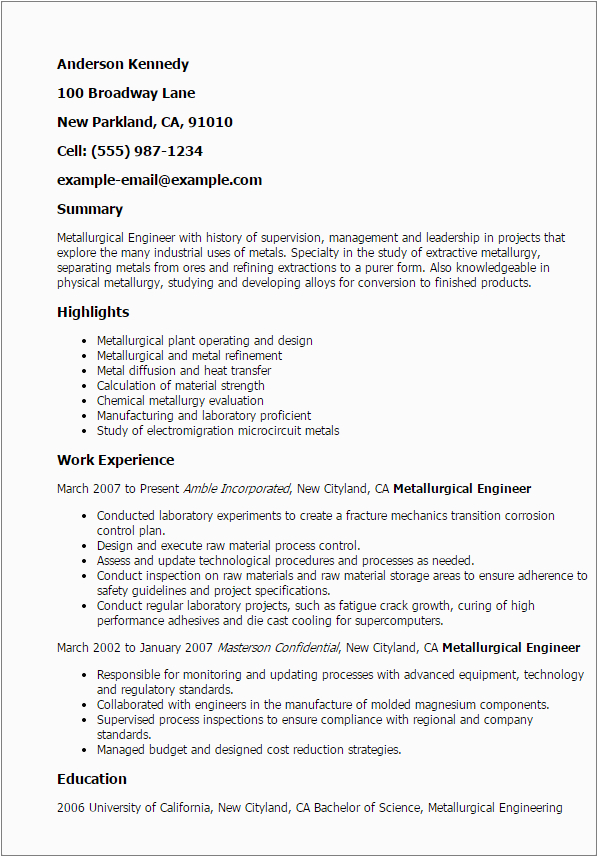 There are in view of that many options for you as you search for the absolute sample resume for experienced metallurgical engineer, and like some hard put it on and perseverance upon your part, you will find yourself bearing in mind a first-class resume in no time, and hopefully, a first-class employer, as well!. For more guidance upon resumes or for a sample resume for experienced metallurgical engineer checkout this recommended websites.