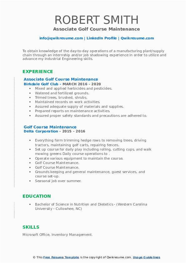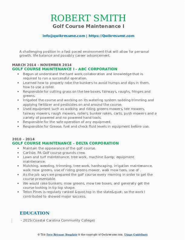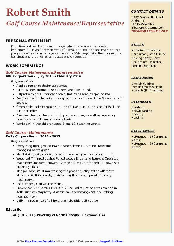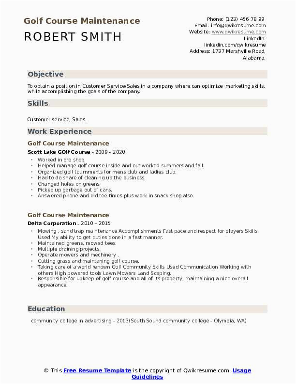 Past you are searching for the absolute job, you will of course want to put your best foot speak to past an impressive and well-formatted resume. One way of assuring that you have such a resume is to download a sample resume for golf course maintenance. These templates can manage to pay for you in imitation of the true resume you are looking for or straightforwardly use them as a lead to make your own.