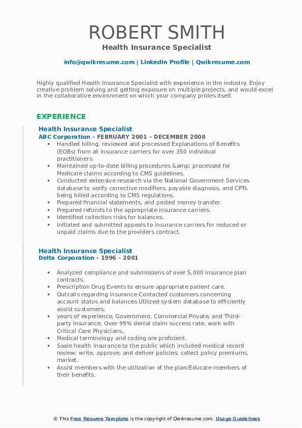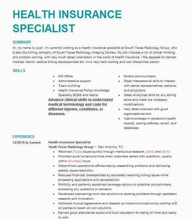 Sample Resume for Health Insurance Specialist Insurance Specialist Resume Samples and all other pictures, designs or photos on our website are copyright of their respective owners. we get our pictures from another websites, search engines and other sources to use as an inspiration for you. please contact us if you think we are infringing copyright of your pictures using contact page. we will be very happy to help you.