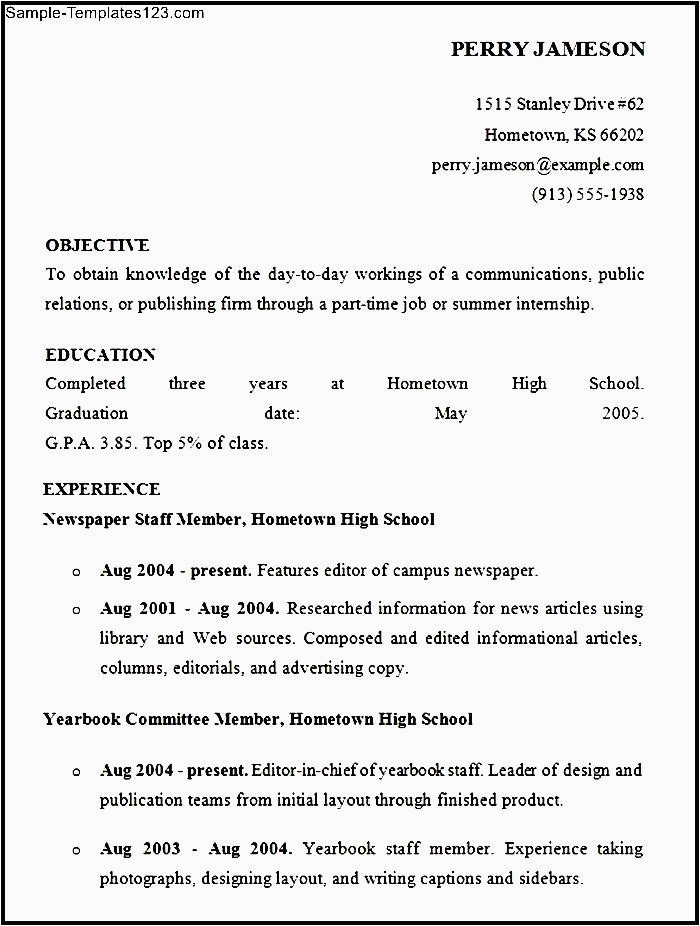 There will be many career books and guides that you can search out at the library or bookstore, which will have at least one sample resume for high school student summer job for you to study, oftentimes more.