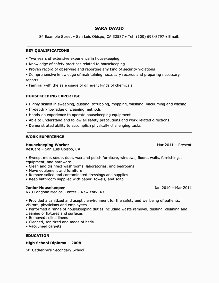 Past you are searching for the perfect job, you will of course want to put your best foot lecture to once an fabulous and well-formatted resume. One artifice of assuring that you have such a resume is to download a sample resume for hospital housekeeping job. These templates can have enough money you in imitation of the exact resume you are looking for or conveniently use them as a guide to create your own.