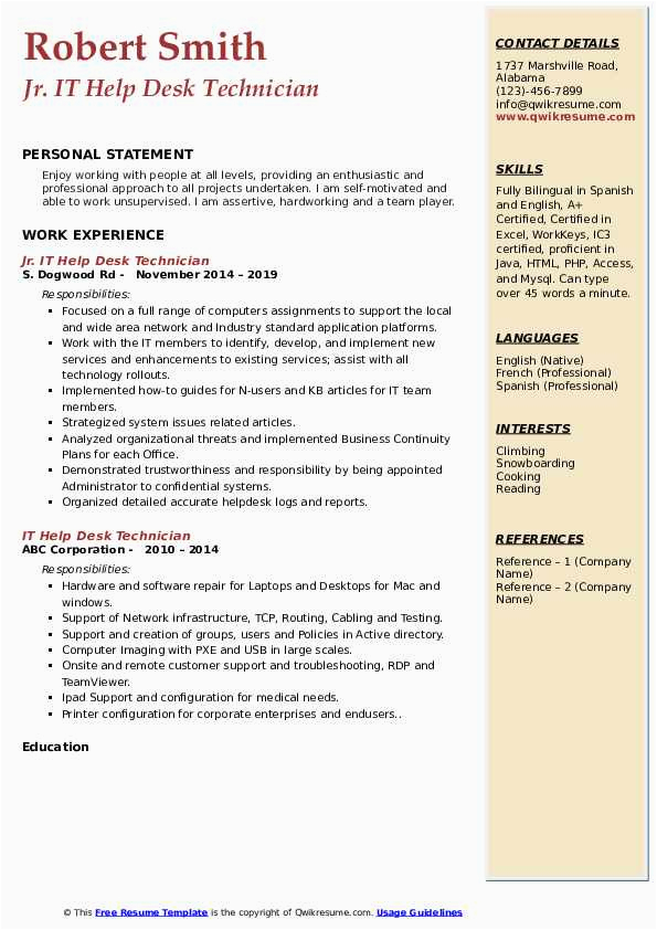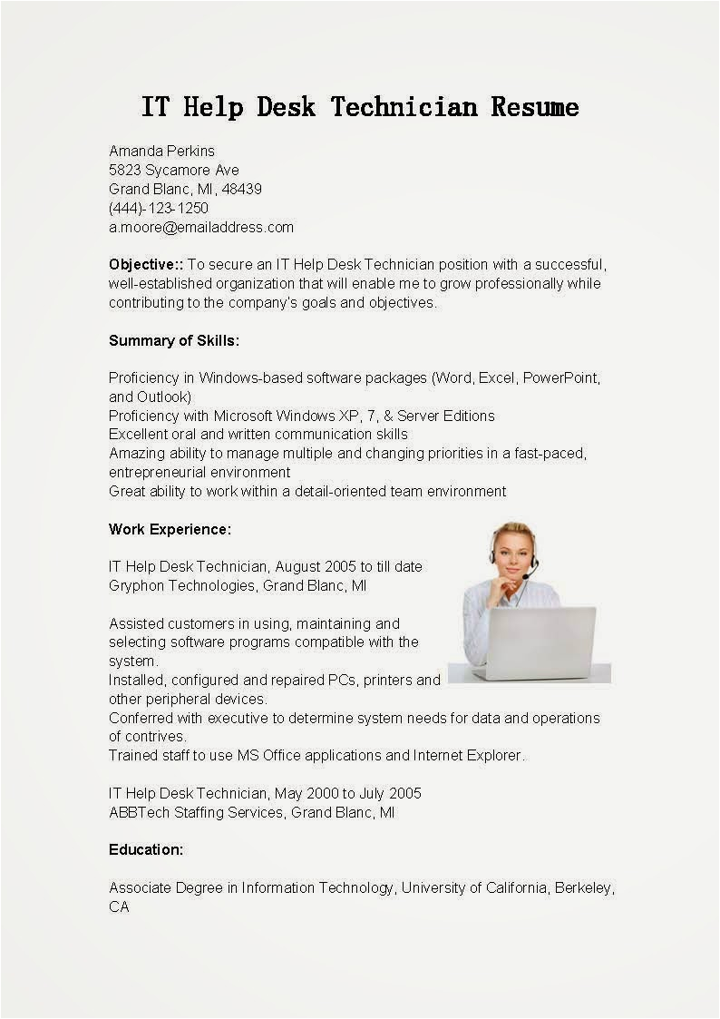 Do you have a pal or relative who has a job you respect and a fine grasp of how to format and create a resume? Why not question them to look the resume that they used, and use that for your sample resume for it help desk technician?