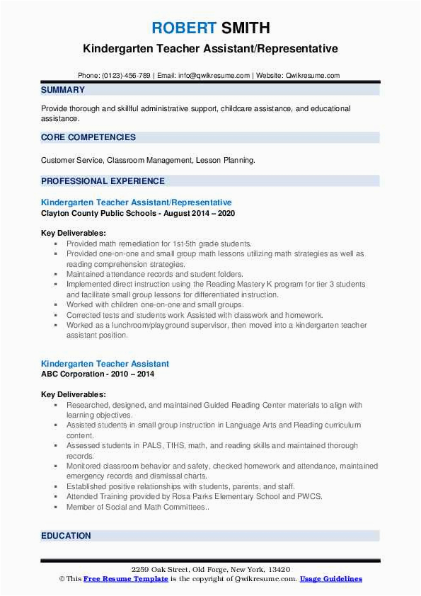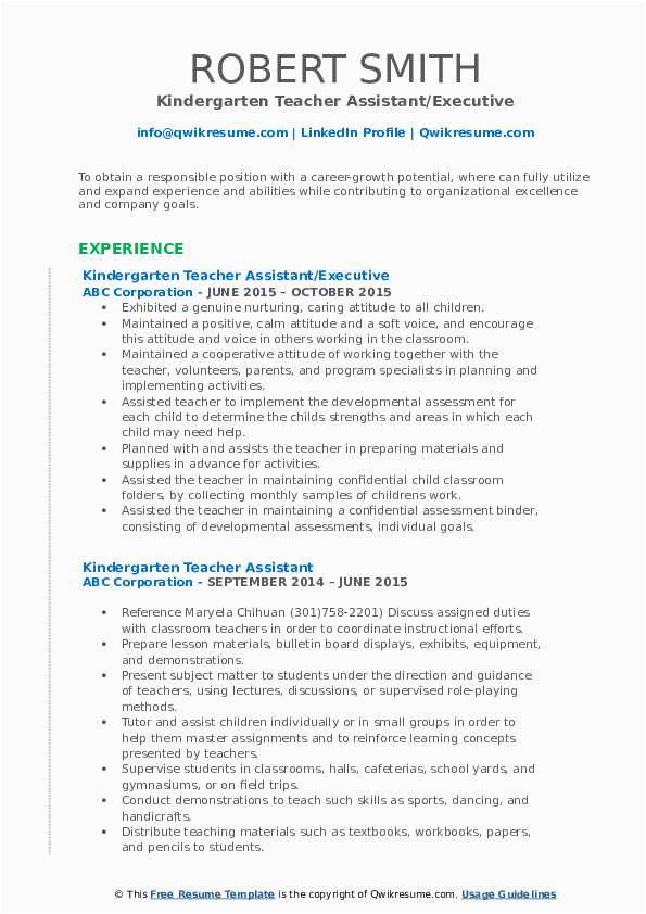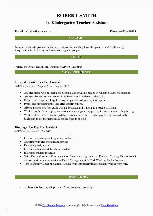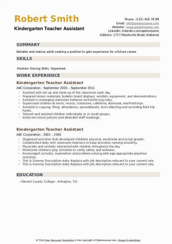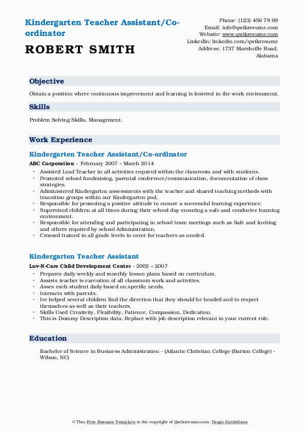 However, these are not your only options for locating sample resume for kindergarten teacher assistant. Your hypothetical or the academy will most assuredly have more than one resume template that you can use, and will be happy to encourage you. straightforwardly head beyond to their Placement Office and you will have a template in no time. After all, it is their job to back you find employment, and in the manner of you are successful and a satisfied and profitably employed former student, it is moreover a feather in their cap.