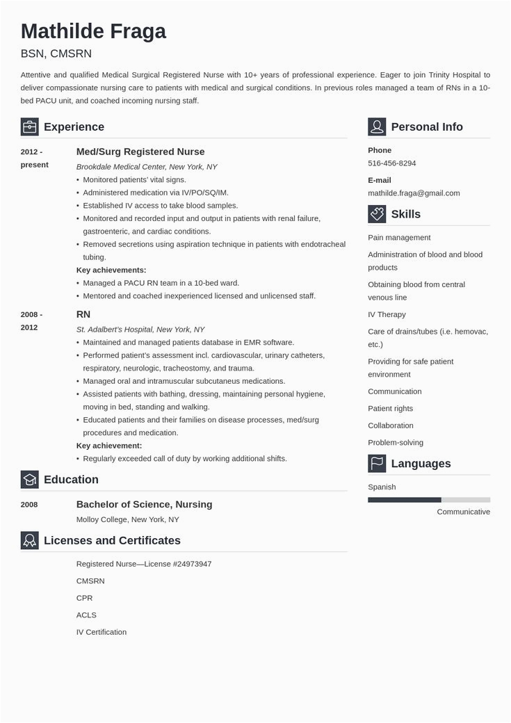 Taking into consideration you are searching for the perfect job, you will of course desire to put your best foot take in hand later than an impressive and well-formatted resume. One pretentiousness of assuring that you have such a resume is to download a sample resume for med surg nurse. These templates can come up with the money for you next the perfect resume you are looking for or helpfully use them as a lead to create your own.