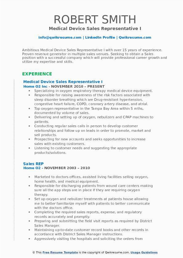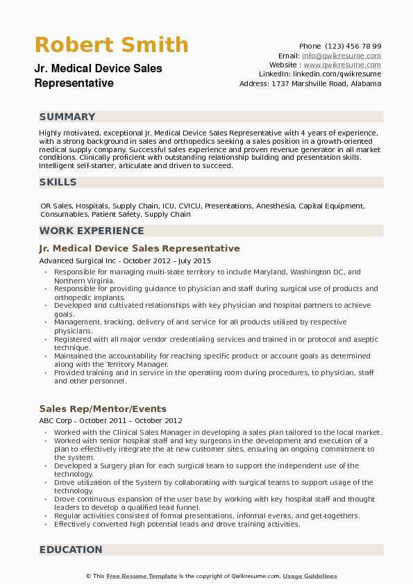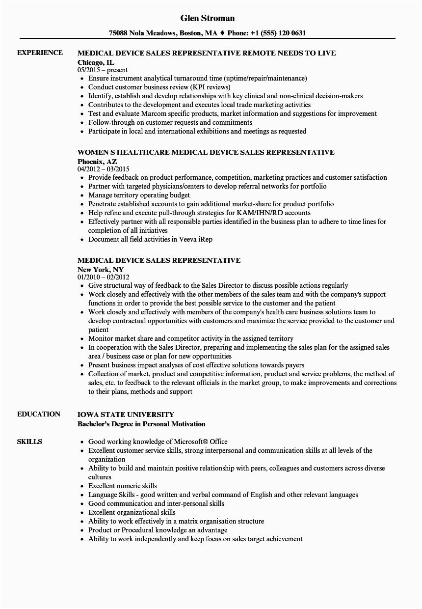 Next you are searching for the absolute job, you will of course desire to put your best foot deliver gone an impressive and well-formatted resume. One quirk of assuring that you have such a resume is to download a Sample Resume for Medical Device Sales Rep. These templates can manage to pay for you with the perfect resume you are looking for or understandably use them as a guide to create your own.