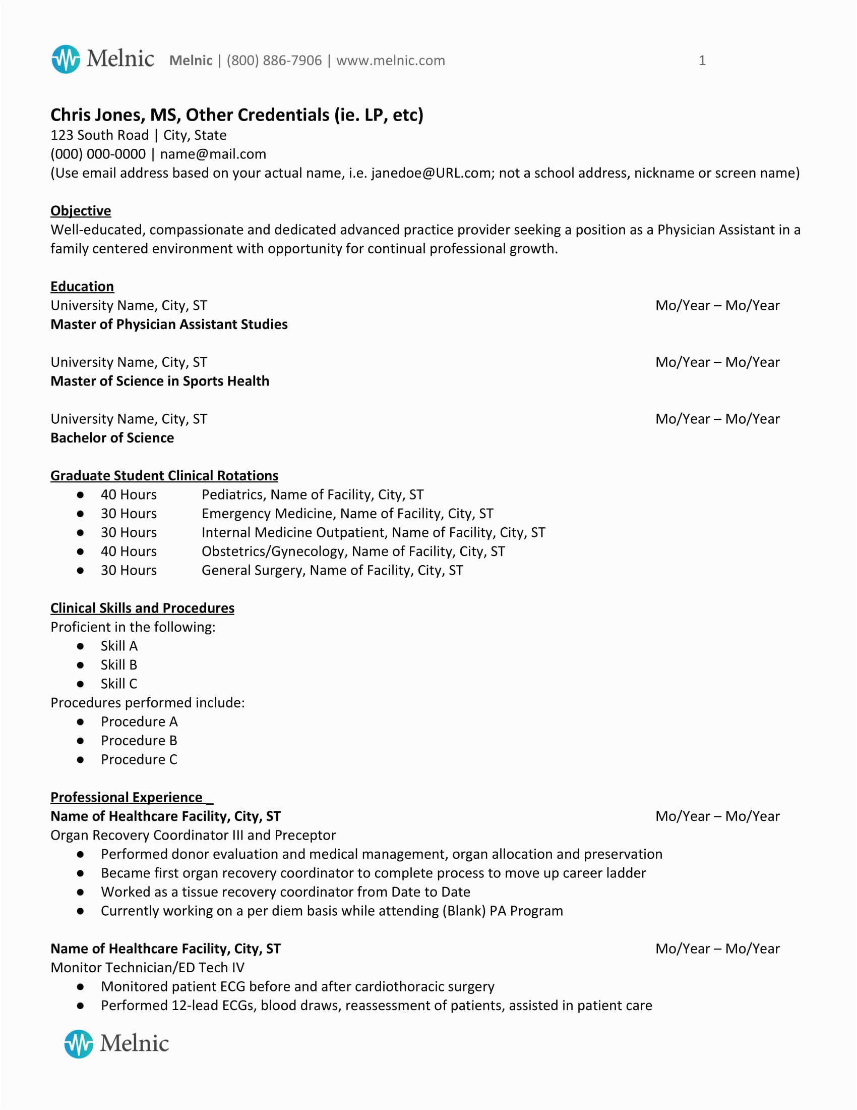 Physician Assistant Sample Resume for Job Seekers Melnic