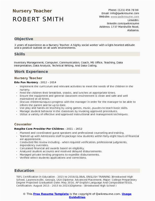 You could along with download a template from the Internet; there are an abundance of websites where you will be competent to find a sample resume for nursery school teacher, either to suitably peruse or to download and use.