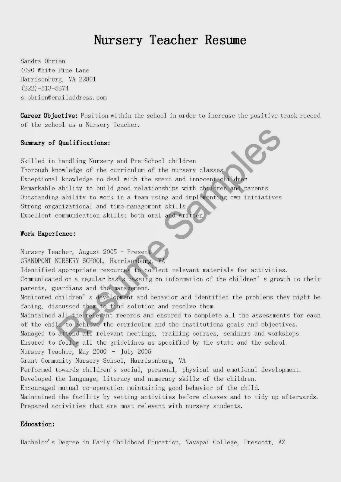 And for all website you come across that has a sample resume for nursery school teacher, you will find that there are specialized templates for just more or less any type of resume you wish to create. You can locate a sample resume for nursery school teacher for an entry-level position, and you can locate a template for just roughly any type of job or career you are looking for.