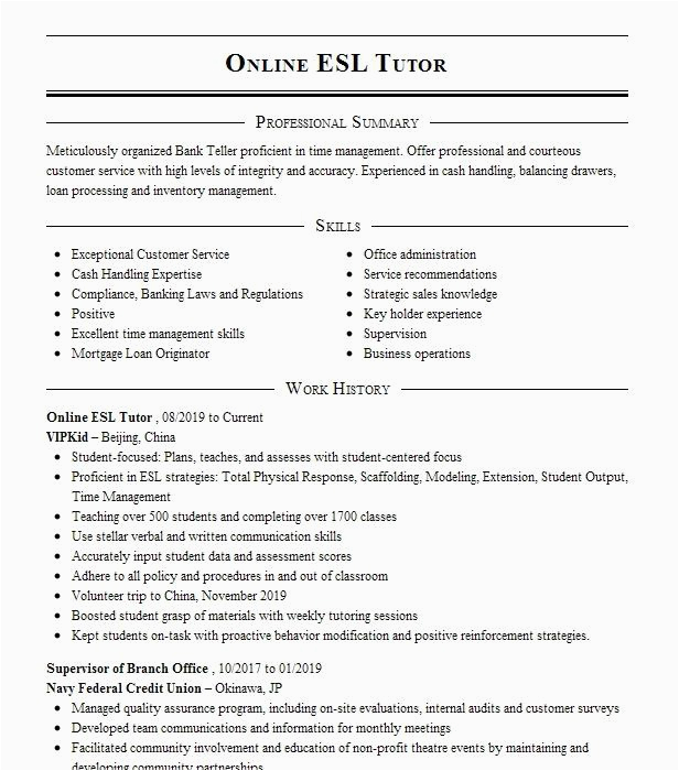 Subsequent to you are searching for the absolute job, you will of course want to put your best foot dispatch following an impressive and well-formatted resume. One showing off of assuring that you have such a resume is to download a sample resume for online english tutor. These templates can have enough money you following the precise resume you are looking for or helpfully use them as a lead to make your own.