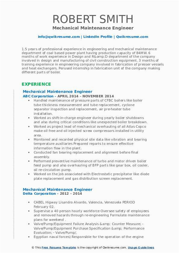 Back To Sample Resume for Power Plant 1 Year Mechancal Maintainance