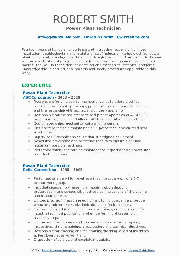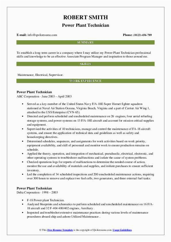 Sample Resume for Power Plant 1 Year Mechancal Maintainance Power Plant Technician Resume Samples and all other pictures, designs or photos on our website are copyright of their respective owners. we get our pictures from another websites, search engines and other sources to use as an inspiration for you. please contact us if you think we are infringing copyright of your pictures using contact page. we will be very happy to help you.