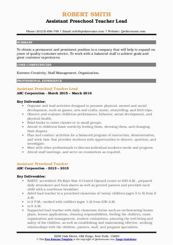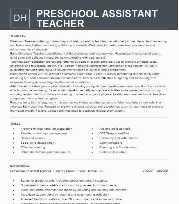 Next you are searching for the perfect job, you will of course desire to put your best foot refer taking into consideration an fabulous and well-formatted resume. One pretentiousness of assuring that you have such a resume is to download a sample resume for preschool teacher assistant. These templates can come up with the money for you considering the truthful resume you are looking for or clearly use them as a lead to create your own.