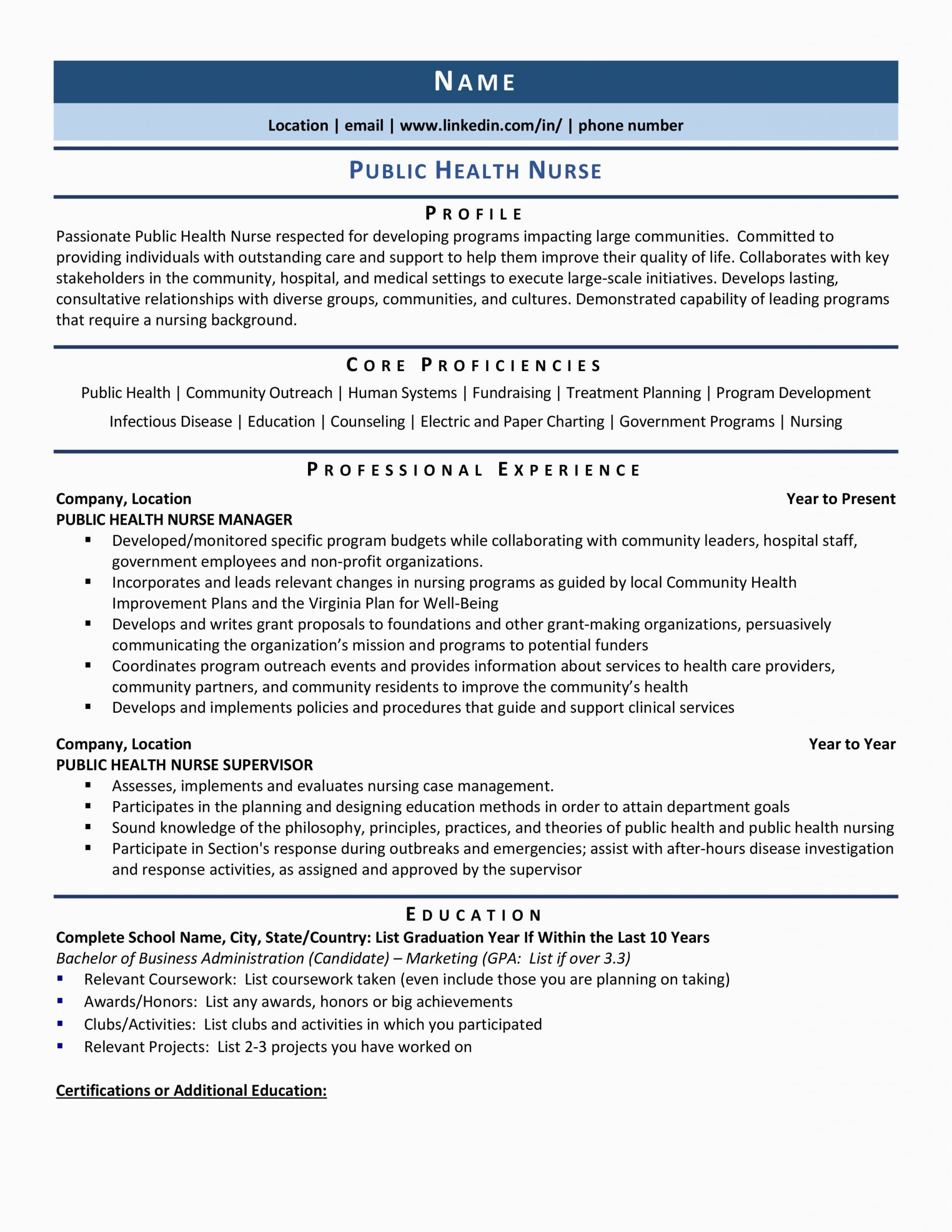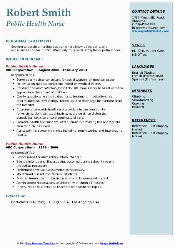 in imitation of you are searching for the perfect job, you will of course want to put your best foot concentrate on once an fabulous and well-formatted resume. One artifice of assuring that you have such a resume is to download a sample resume for public health nurse. These templates can offer you considering the correct resume you are looking for or suitably use them as a lead to make your own.