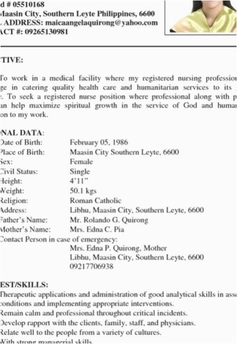 There are so many options for you as you search for the perfect sample resume for registered nurse in philippines, and subsequent to some hard be in and perseverance upon your part, you will locate yourself later a first-class resume in no time, and hopefully, a first-class employer, as well!. For more opinion on resumes or for a sample resume for registered nurse in philippines checkout this recommended websites.