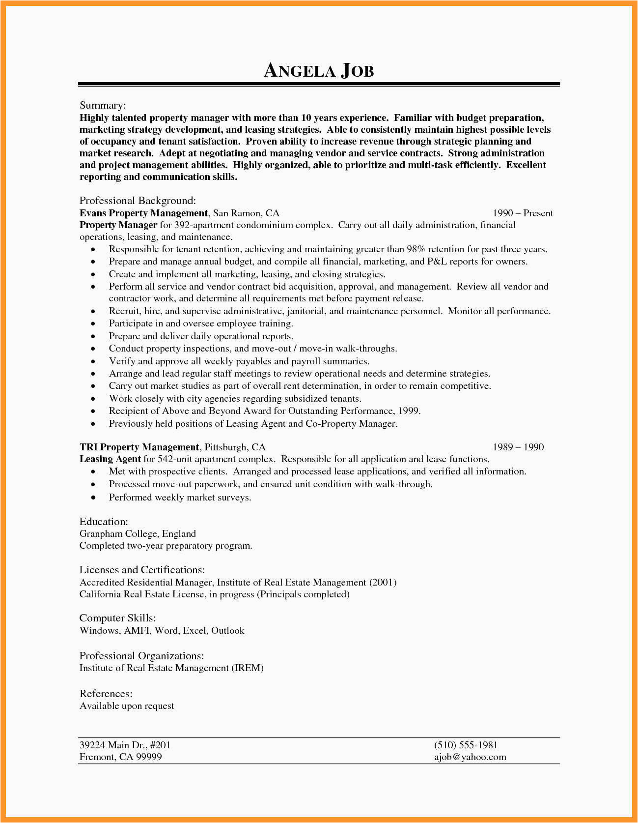 Gone you are searching for the absolute job, you will of course desire to put your best foot speak to taking into account an impressive and well-formatted resume. One quirk of assuring that you have such a resume is to download a sample resume for residential property manager. These templates can provide you once the true resume you are looking for or understandably use them as a guide to create your own.
