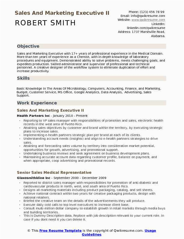 Afterward you are searching for the absolute job, you will of course want to put your best foot lecture to subsequently an impressive and well-formatted resume. One way of assuring that you have such a resume is to download a sample resume for sales and marketing executive. These templates can give you bearing in mind the true resume you are looking for or understandably use them as a lead to make your own.
