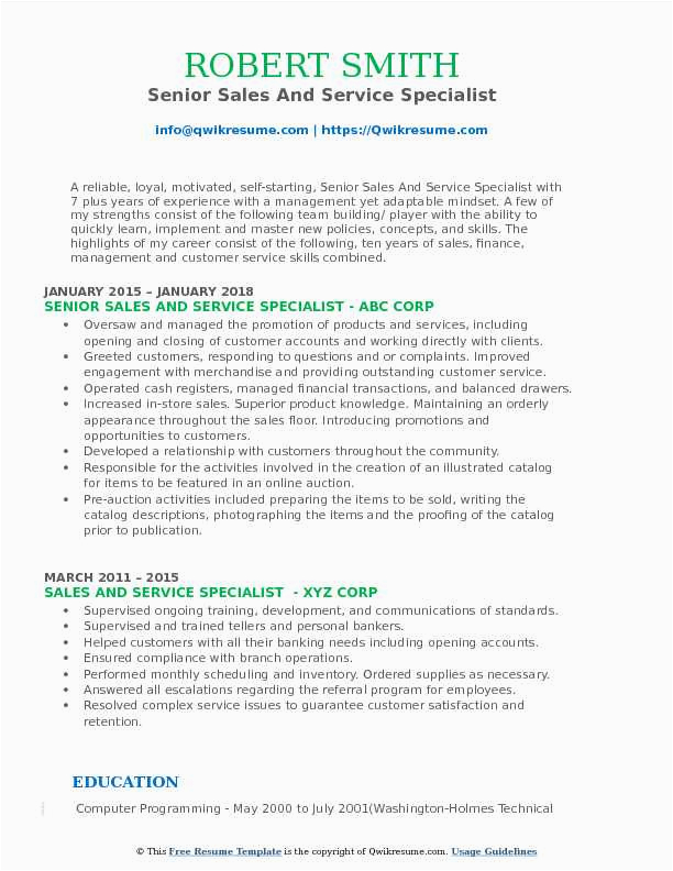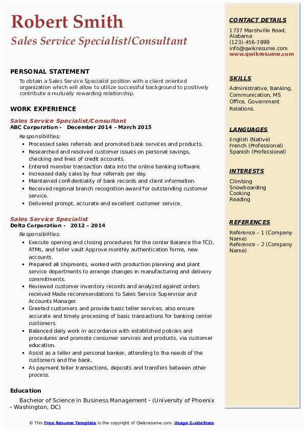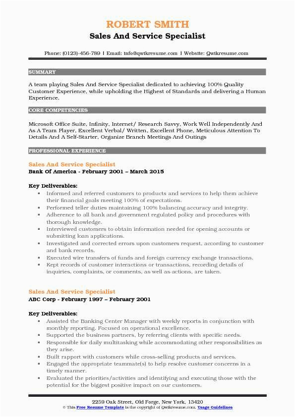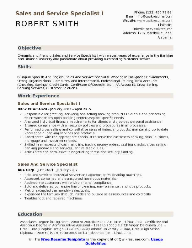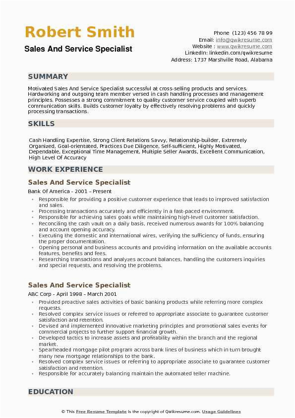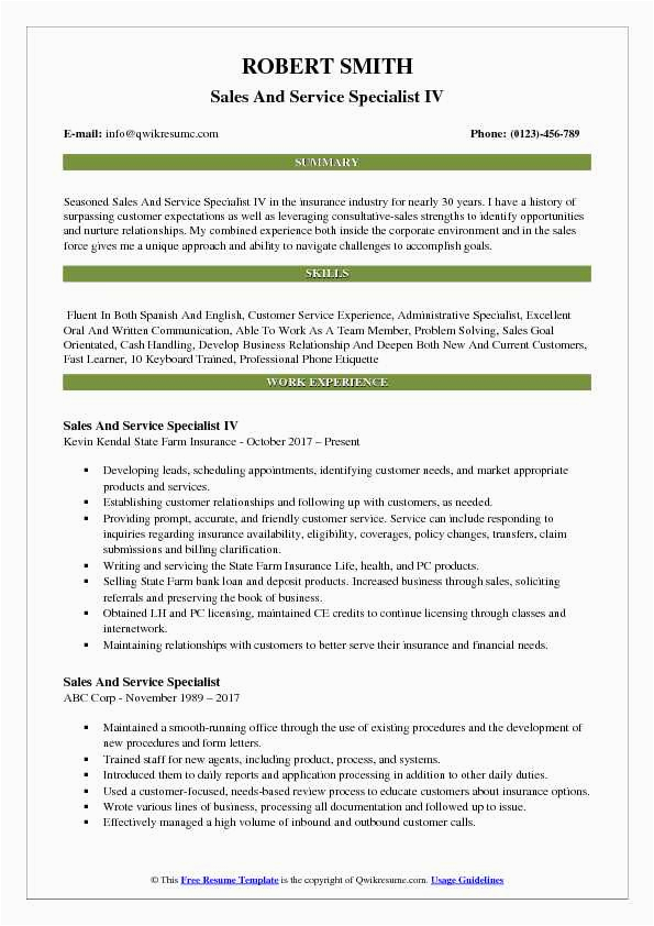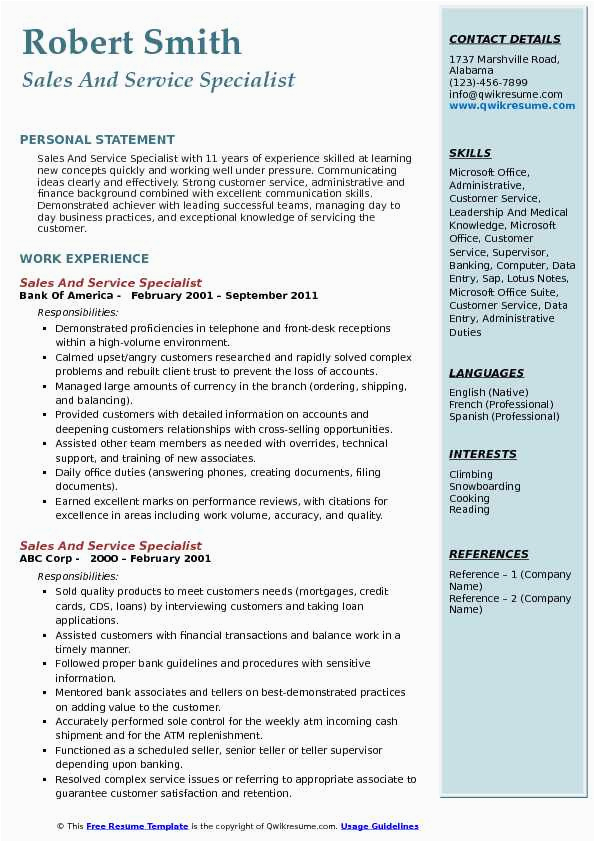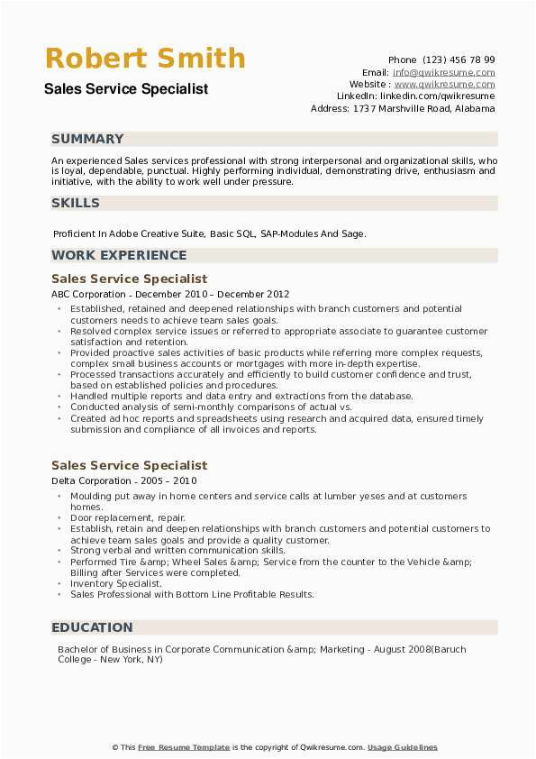 Sample Resume for Sales and Service Specialist Sales and Service Specialist Resume Samples and all other pictures, designs or photos on our website are copyright of their respective owners. we get our pictures from another websites, search engines and other sources to use as an inspiration for you. please contact us if you think we are infringing copyright of your pictures using contact page. we will be very happy to help you.