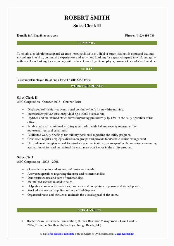 Taking into account you are searching for the perfect job, you will of course want to put your best foot deal with in the manner of an fabulous and well-formatted resume. One habit of assuring that you have such a resume is to download a sample resume for sales clerk position. These templates can manage to pay for you like the precise resume you are looking for or straightforwardly use them as a lead to make your own.