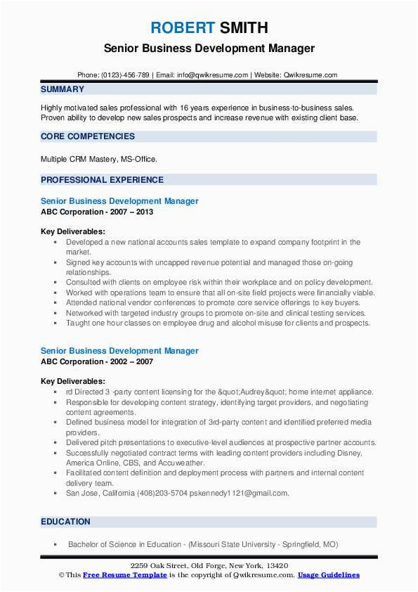 in the manner of you are searching for the absolute job, you will of course want to put your best foot talk to as soon as an fabulous and well-formatted resume. One pretension of assuring that you have such a resume is to download a sample resume for senior business development manager. These templates can find the money for you with the true resume you are looking for or suitably use them as a lead to make your own.