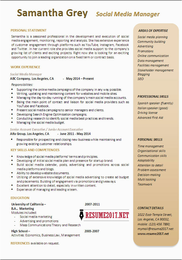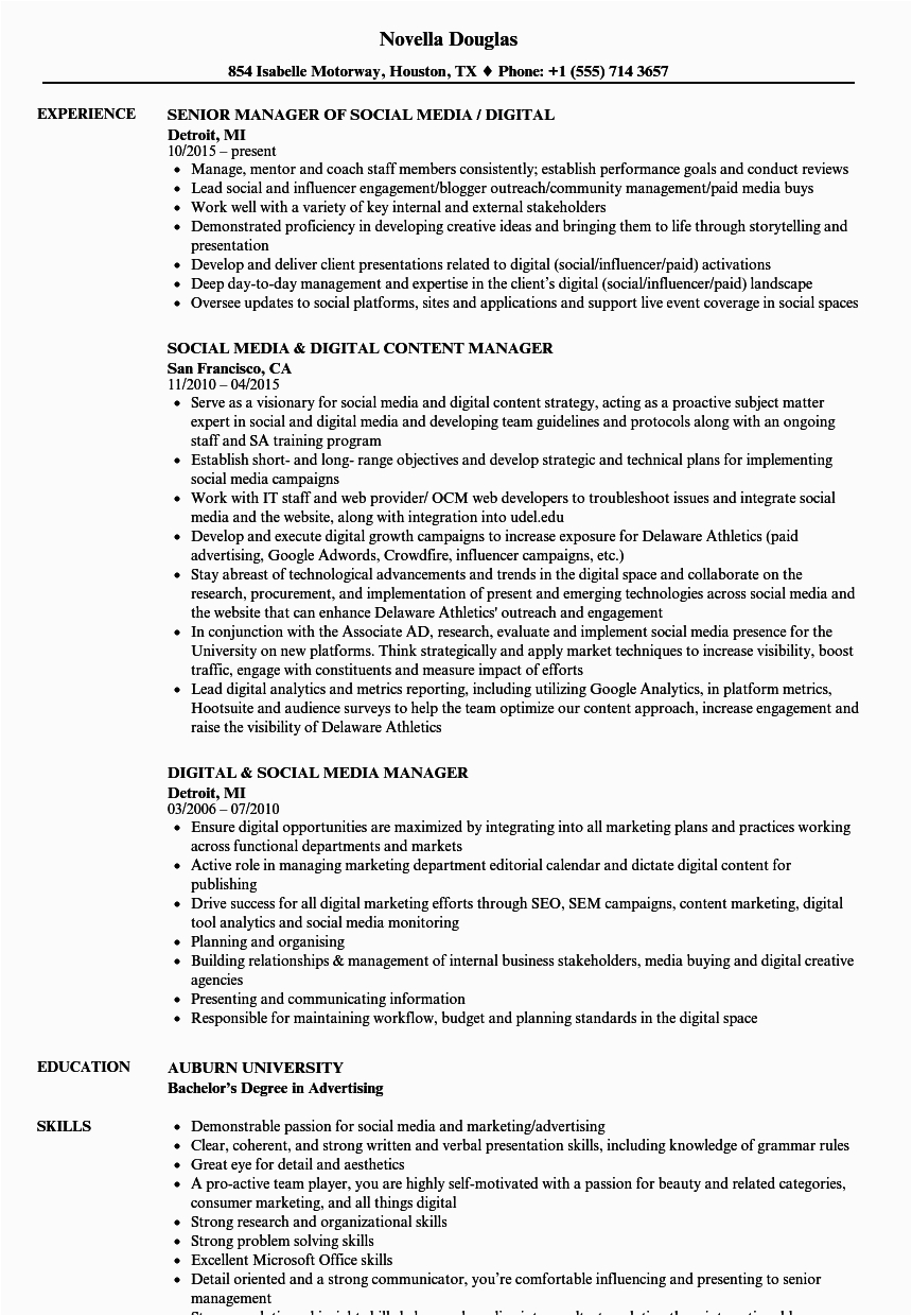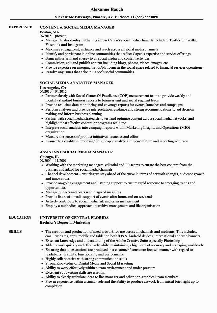 However, these are not your without help options for locating sample resume for social media manager. Your college or university circles will most assuredly have more than one resume template that you can use, and will be happy to assist you. comprehensibly head on top of to their Placement Office and you will have a template in no time. After all, it is their job to encourage you locate employment, and as soon as you are rich and a satisfied and favorably employed former student, it is as a consequence a feather in their cap.