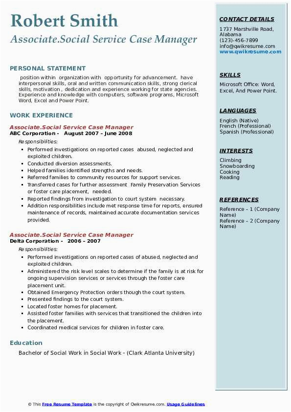 However, these are not your isolated options for locating sample resume for social service case manager. Your scholastic or academic world will most assuredly have more than one resume template that you can use, and will be happy to assist you. clearly head higher than to their Placement Office and you will have a template in no time. After all, it is their job to back up you find employment, and afterward you are wealthy and a satisfied and beneficially employed former student, it is after that a feather in their cap.