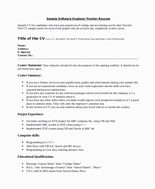 Sample Resume for software Developer Fresher Resume for Freshers software Enginer Let Your Curriculum Vitae Do the and all other pictures, designs or photos on our website are copyright of their respective owners. we get our pictures from another websites, search engines and other sources to use as an inspiration for you. please contact us if you think we are infringing copyright of your pictures using contact page. we will be very happy to help you.