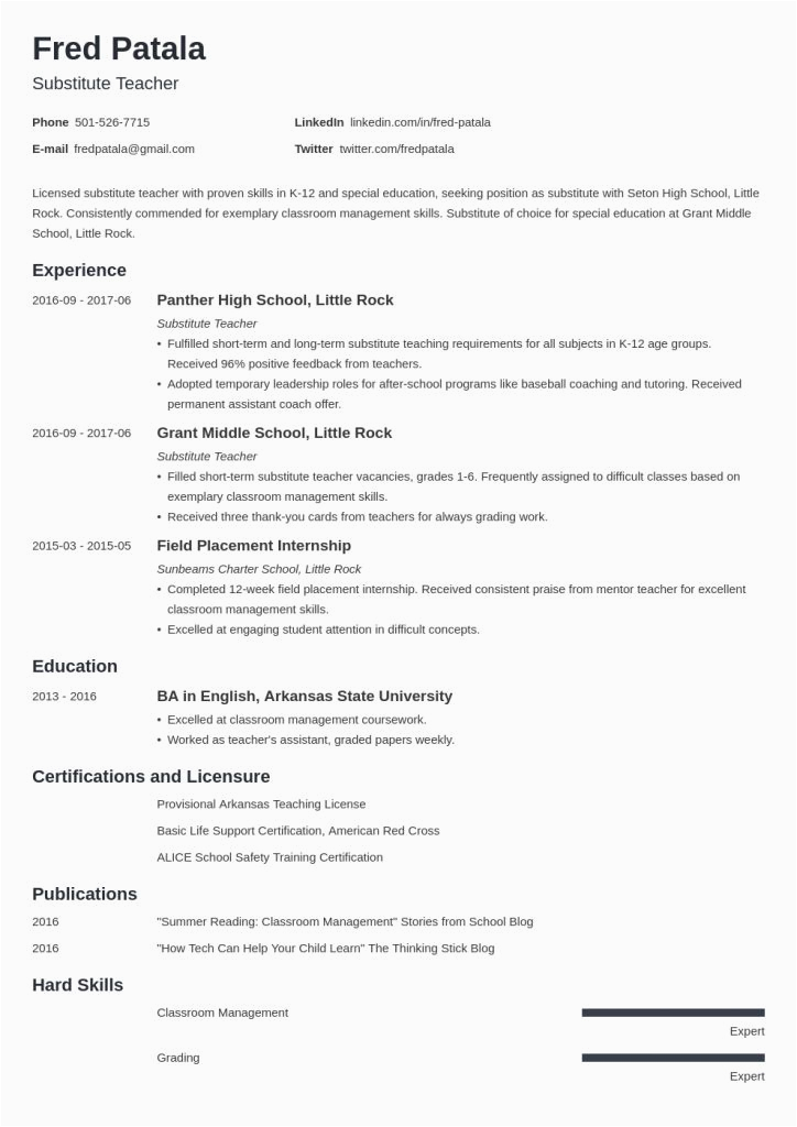 There are consequently many options for you as you search for the absolute sample resume for substitute teacher with no experience, and with some difficult accomplishment and perseverance on your part, you will locate yourself in imitation of a first-class resume in no time, and hopefully, a first-class employer, as well!. For more counsel on resumes or for a sample resume for substitute teacher with no experience checkout this recommended websites.