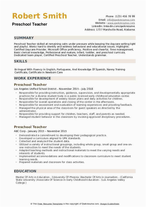 Back To Sample Resume for Teachers for Preschool