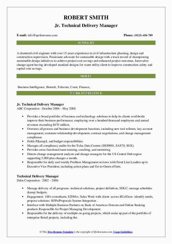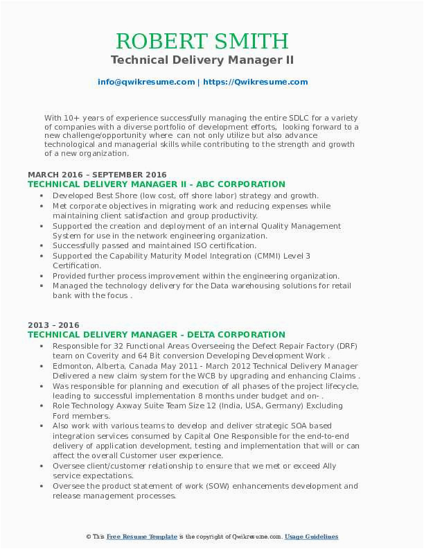 Sample Resume for Technical Delivery Manager Technical Delivery Manager Resume Samples and all other pictures, designs or photos on our website are copyright of their respective owners. we get our pictures from another websites, search engines and other sources to use as an inspiration for you. please contact us if you think we are infringing copyright of your pictures using contact page. we will be very happy to help you.