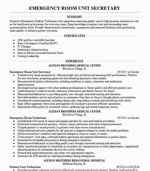 Emergency Room Unit Secretary Resume Example CHI Memorial