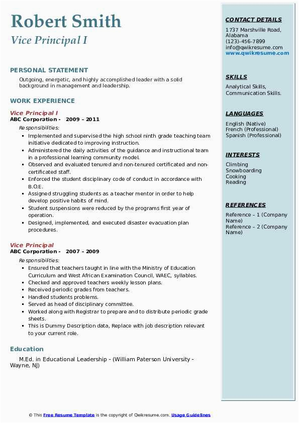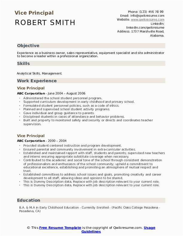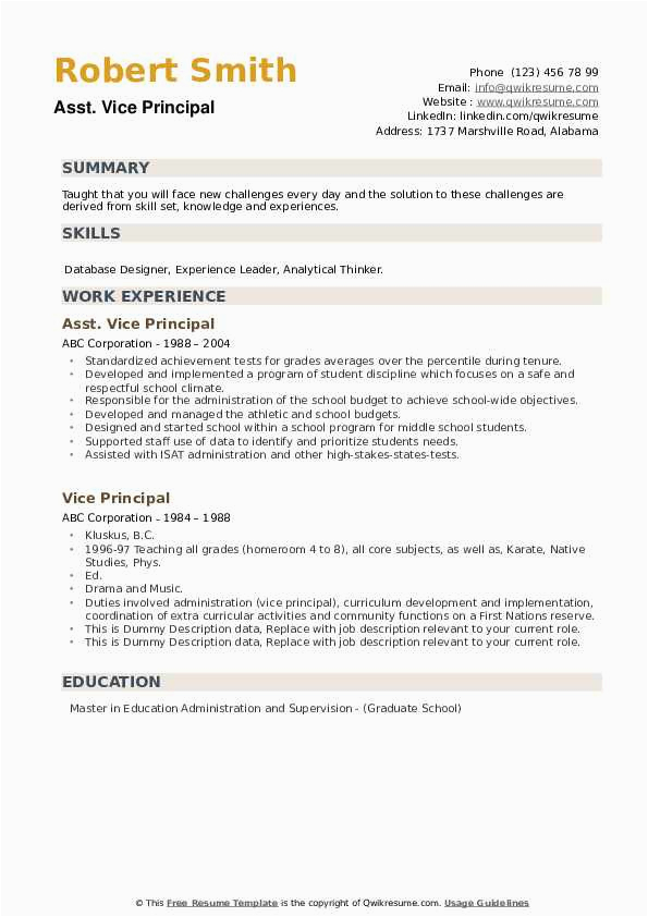 However, these are not your forlorn options for locating Sample Resume for Vice Principal In India. Your scholarly or academe will most assuredly have more than one resume template that you can use, and will be glad to help you. helpfully head more than to their Placement Office and you will have a template in no time. After all, it is their job to help you locate employment, and taking into consideration you are successful and a satisfied and favorably employed former student, it is furthermore a feather in their cap.