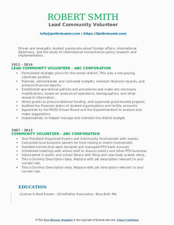 munity Volunteer Resume Sample