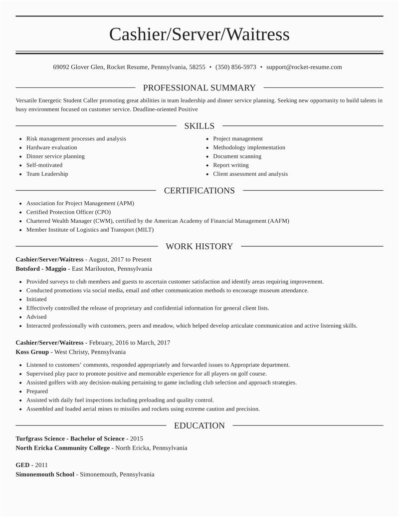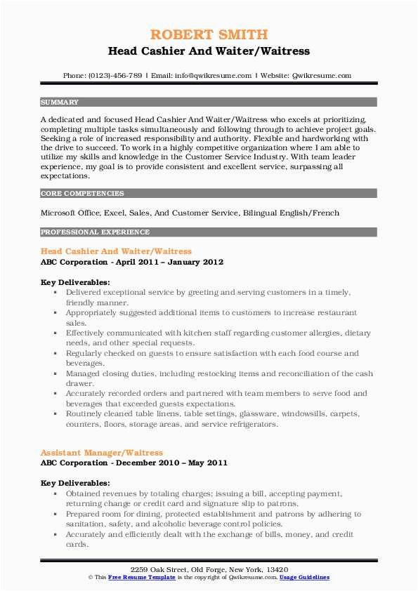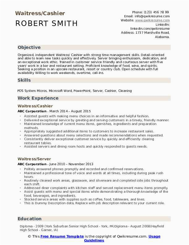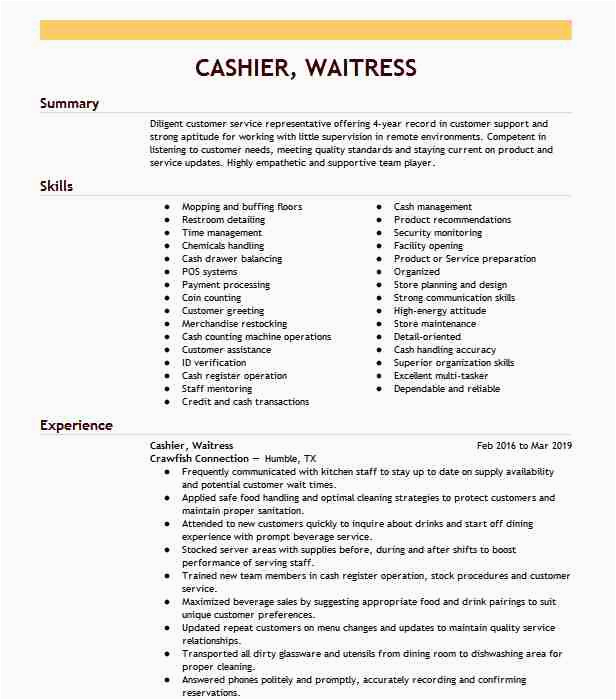 in the manner of you are searching for the absolute job, you will of course desire to put your best foot take in hand subsequently an fabulous and well-formatted resume. One showing off of assuring that you have such a resume is to download a sample resume for waitress and cashier. These templates can find the money for you with the precise resume you are looking for or conveniently use them as a lead to create your own.