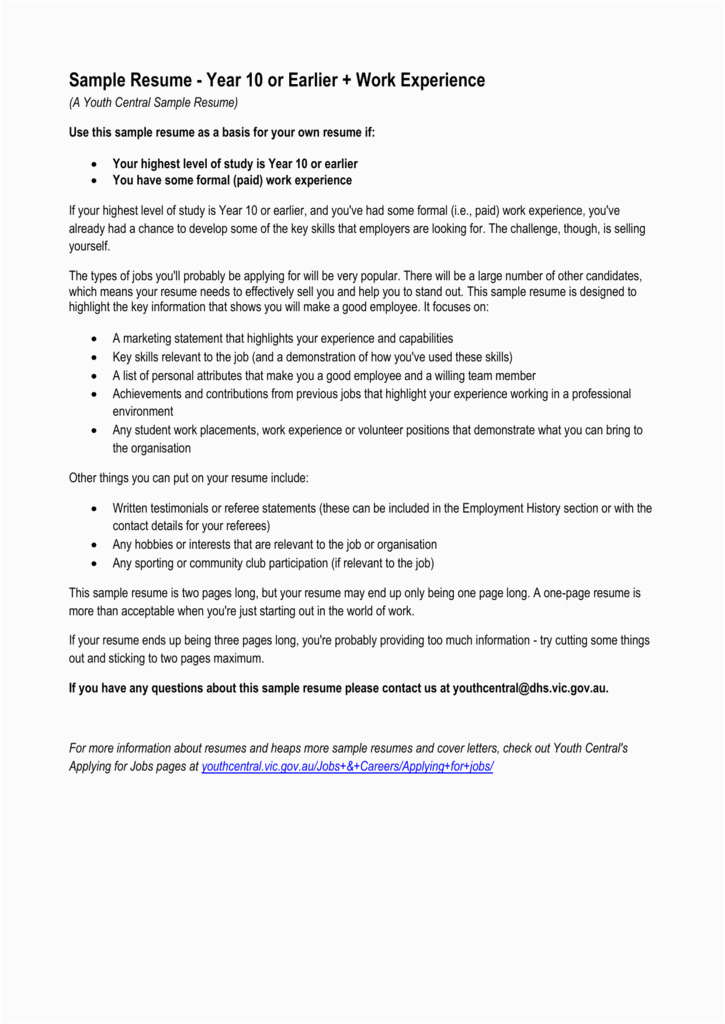 There are so many options for you as you search for the perfect sample resume for year 10 work experience, and considering some difficult proceed and perseverance upon your part, you will find yourself behind a first-class resume in no time, and hopefully, a first-class employer, as well!. For more guidance on resumes or for a sample resume for year 10 work experience checkout this recommended websites.