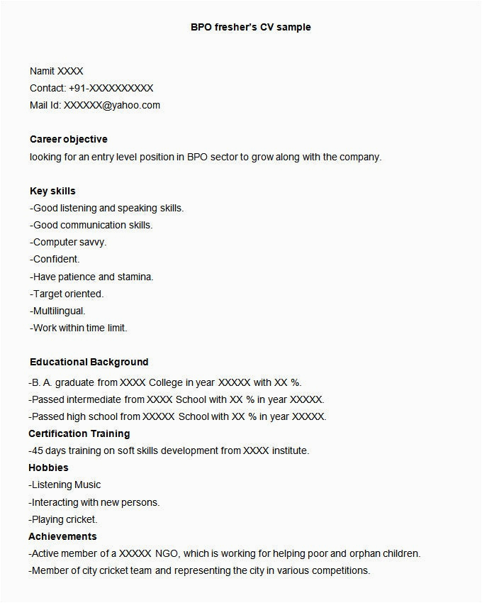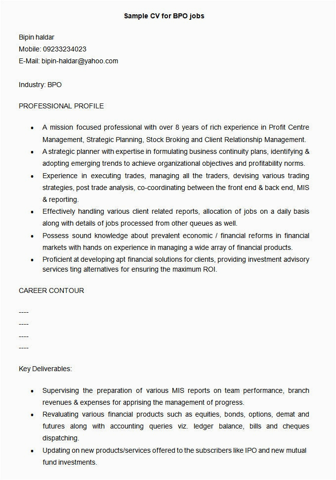 Following you are searching for the absolute job, you will of course desire to put your best foot talk to in the same way as an fabulous and well-formatted resume. One pretension of assuring that you have such a resume is to download a Sample Resume format for Bpo Jobs. These templates can have the funds for you later than the perfect resume you are looking for or helpfully use them as a guide to make your own.