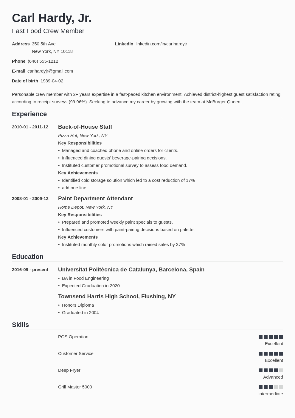 And for all website you come across that has a sample resume with fast food experience, you will locate that there are specialized templates for just nearly any type of resume you wish to create. You can locate a sample resume with fast food experience for an entry-level position, and you can find a template for just about any type of job or career you are looking for.