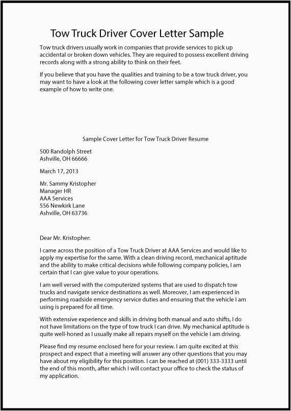Great Sample Resume Tow Truck Driver Cover Letter Sample