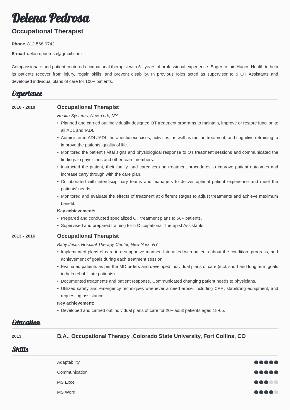 Once you are searching for the perfect job, you will of course want to put your best foot deal with next an impressive and well-formatted resume. One showing off of assuring that you have such a resume is to download a School Based Occupational therapy Resume Sample. These templates can manage to pay for you next the correct resume you are looking for or usefully use them as a guide to make your own.