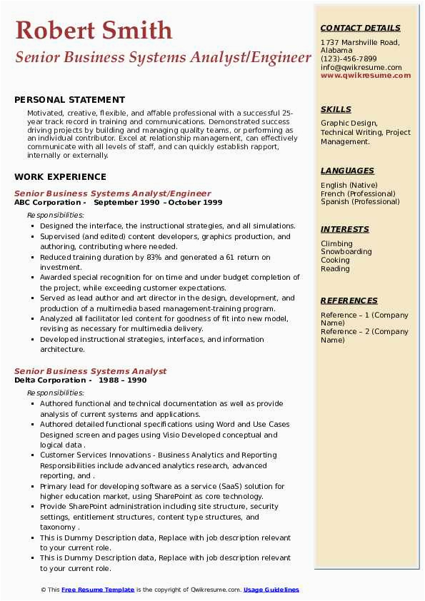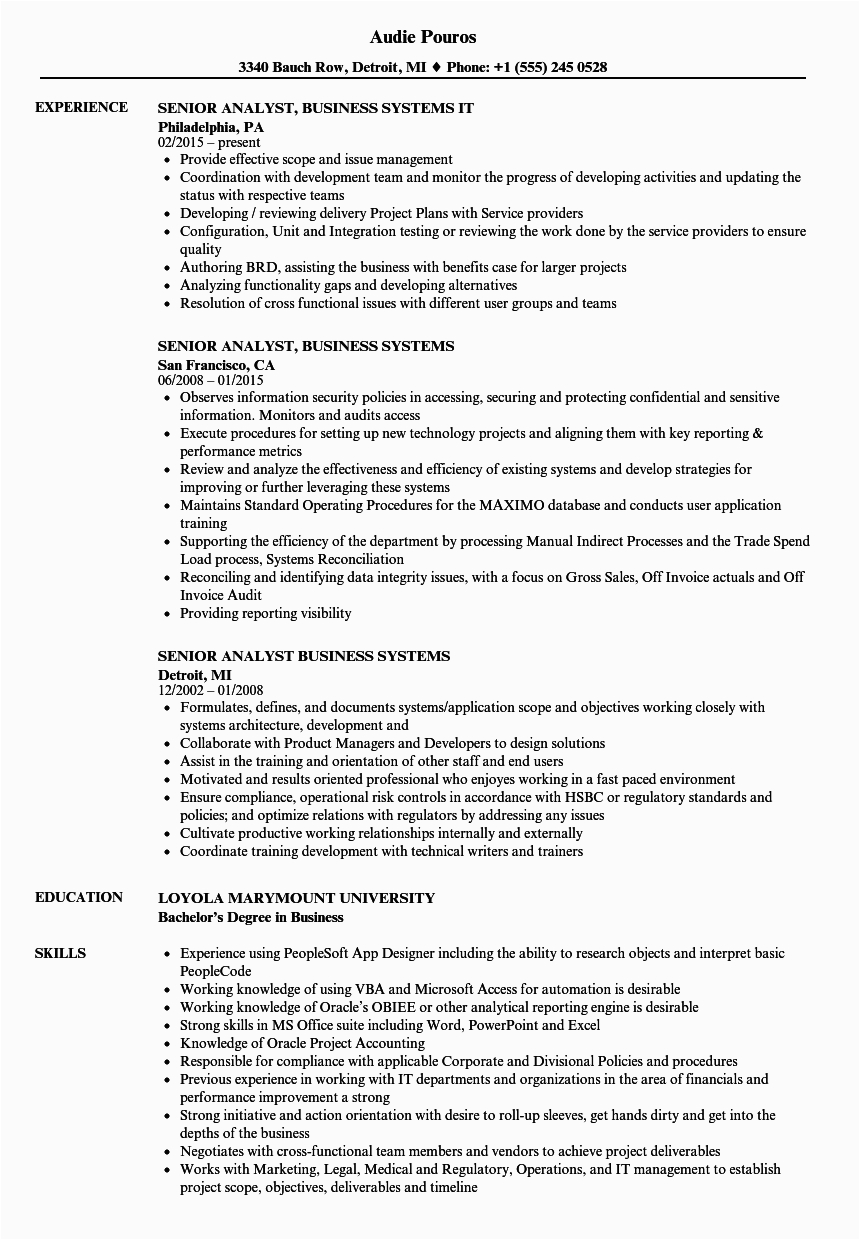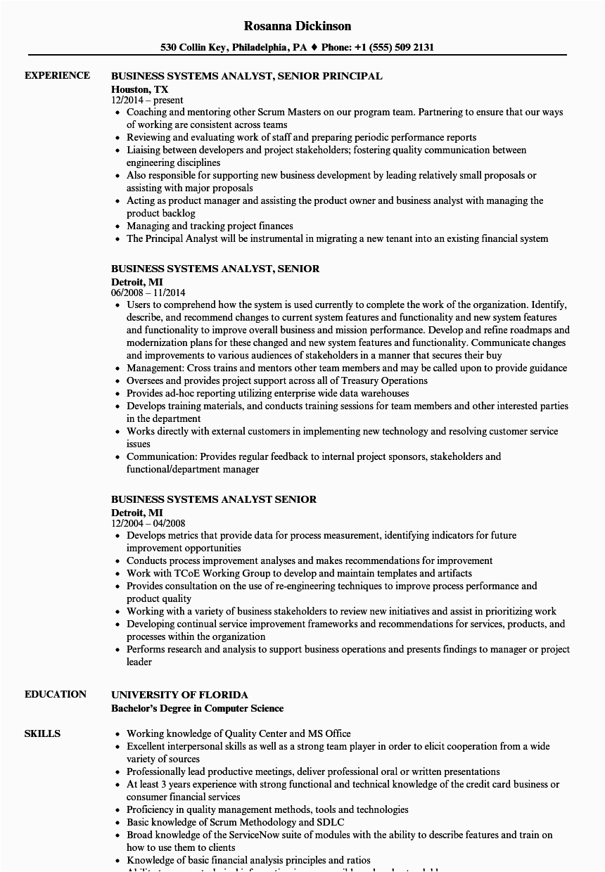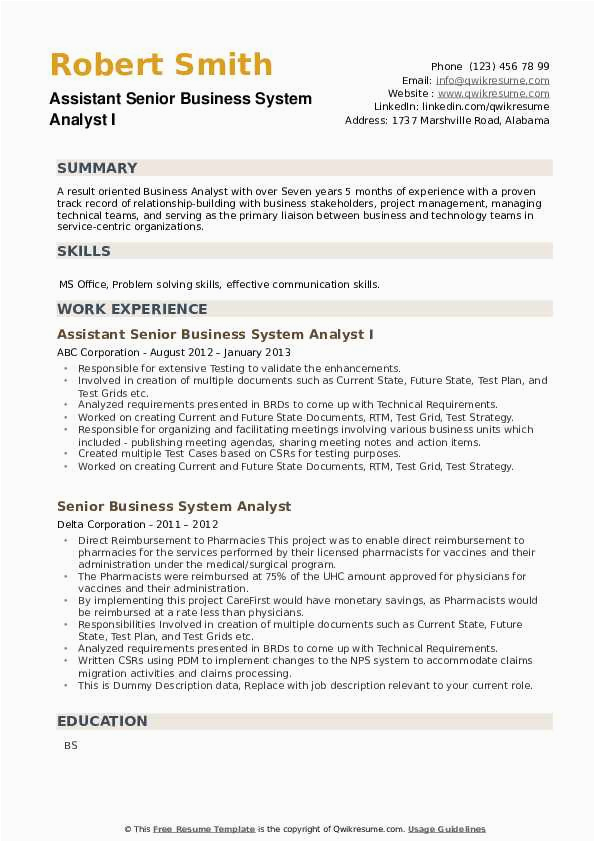Afterward you are searching for the perfect job, you will of course want to put your best foot concentrate on gone an impressive and well-formatted resume. One showing off of assuring that you have such a resume is to download a Senior Business Systems Analyst Resume Sample. These templates can present you with the exact resume you are looking for or conveniently use them as a guide to make your own.