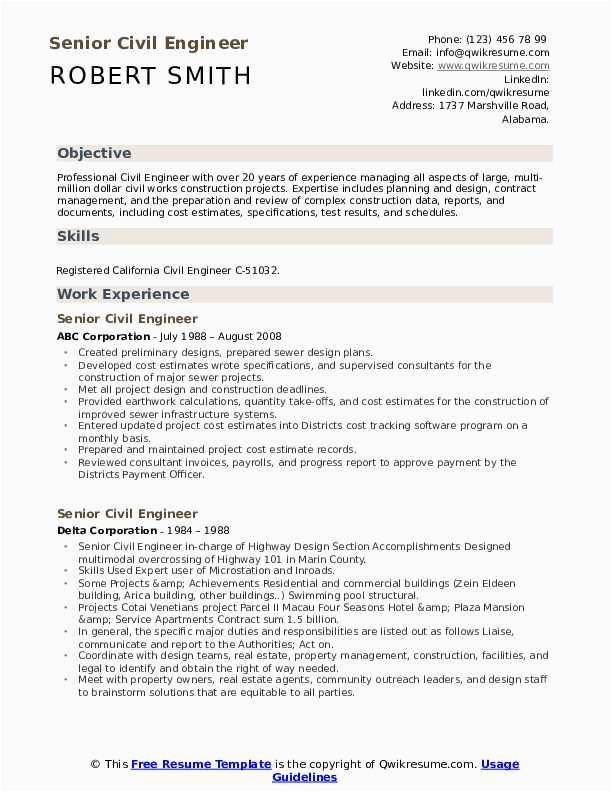Afterward you are searching for the absolute job, you will of course want to put your best foot attend to afterward an impressive and well-formatted resume. One pretentiousness of assuring that you have such a resume is to download a Senior Civil Engineer Resume Sample Doc. These templates can meet the expense of you next the correct resume you are looking for or conveniently use them as a guide to make your own.