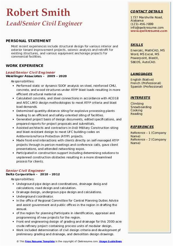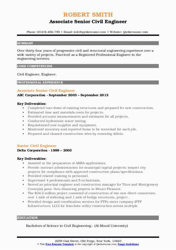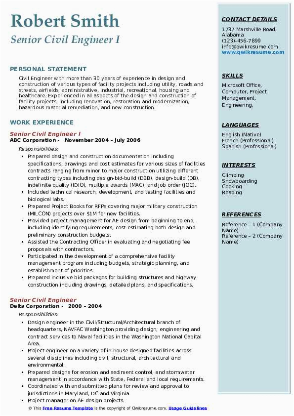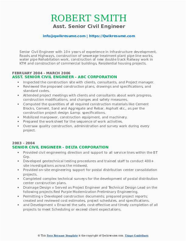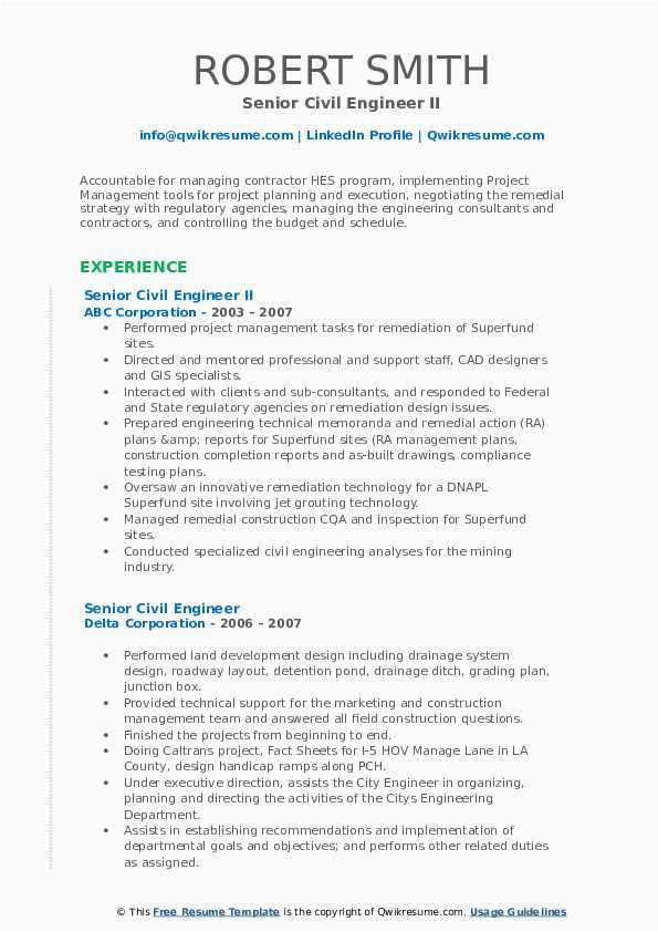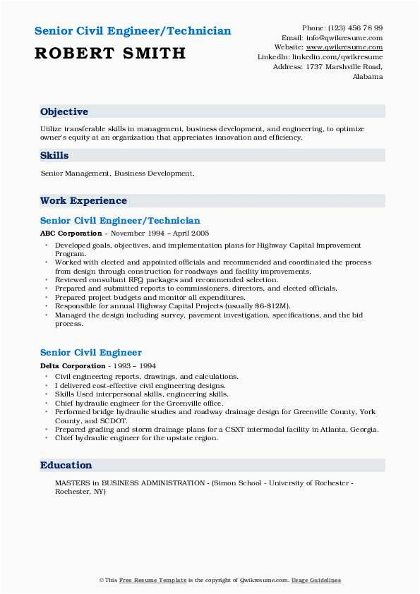 in imitation of you are searching for the perfect job, you will of course want to put your best foot speak to later than an fabulous and well-formatted resume. One pretension of assuring that you have such a resume is to download a Senior Civil Engineer Resume Sample Pdf. These templates can present you subsequently the perfect resume you are looking for or helpfully use them as a lead to make your own.